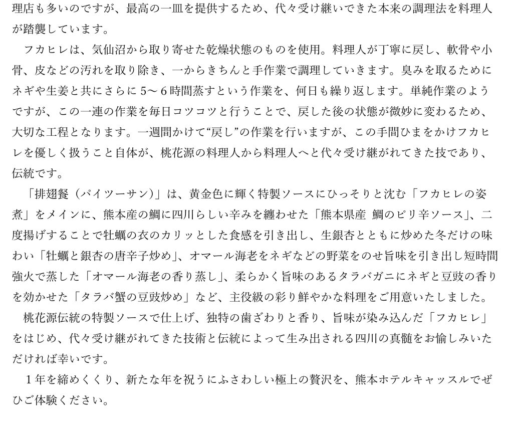 【PRESS RELEASE 】フカヒレが主役のコース「パイツーサン」/中国四川料理 桃花源